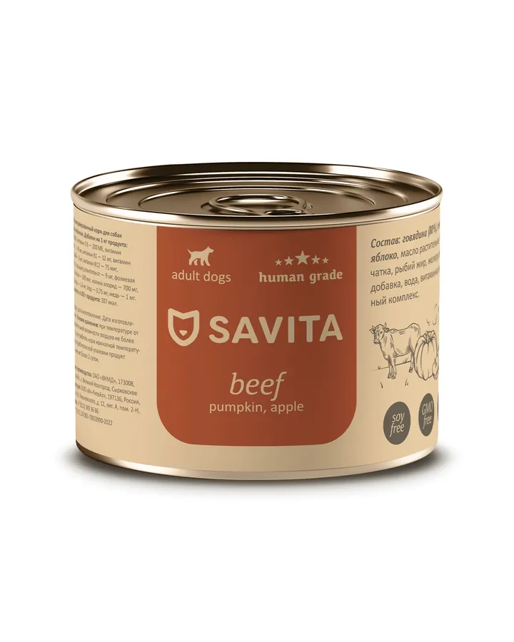 Консервы для собак SAVITA Говядина с тыквой и яблоком 240г