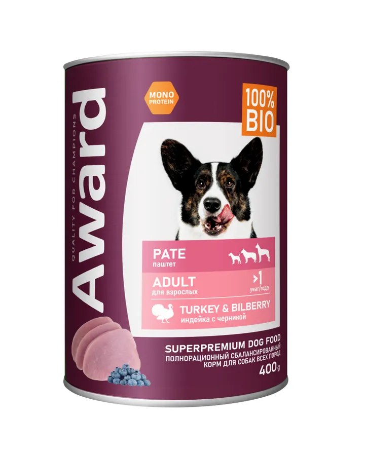 Корм для собак Award 400г паштет из индейки с черникой ж/бХороший влажный корм.