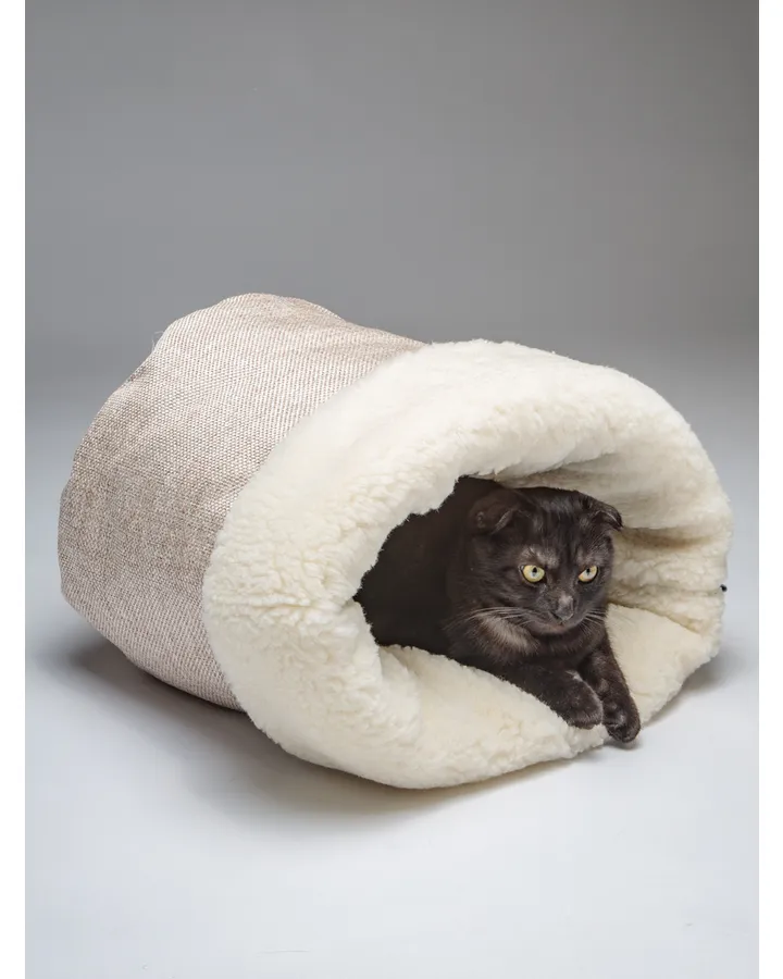 Брала домик нору для сфинкса, ему понравилось, спит в ней. В нору спокойно помещается небольшой флисовый плед и кот весом 4 кг, есть где развернуться. Мех тёплый.