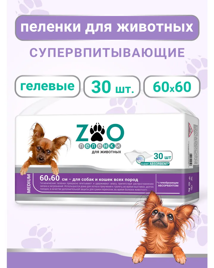 Пелёнки одноразовые впитывающие ZOO для животных 60x90 см 30 шт