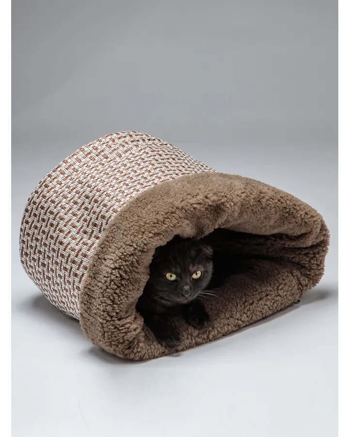 Брала домик нору для сфинкса, ему понравилось, спит в ней. В нору спокойно помещается небольшой флисовый плед и кот весом 4 кг, есть где развернуться. Мех тёплый.