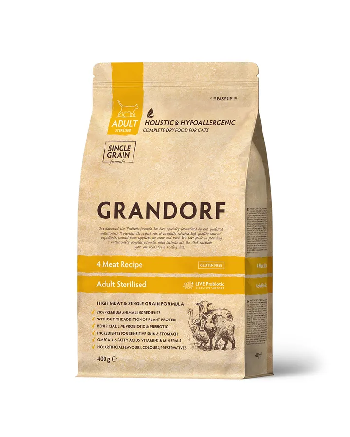 5Корм для кошек Grandorf 2кг для стерилизованных четыре мясаМоя кошка аллергик и может кушать только этот корм, так что нас всё устраивает)