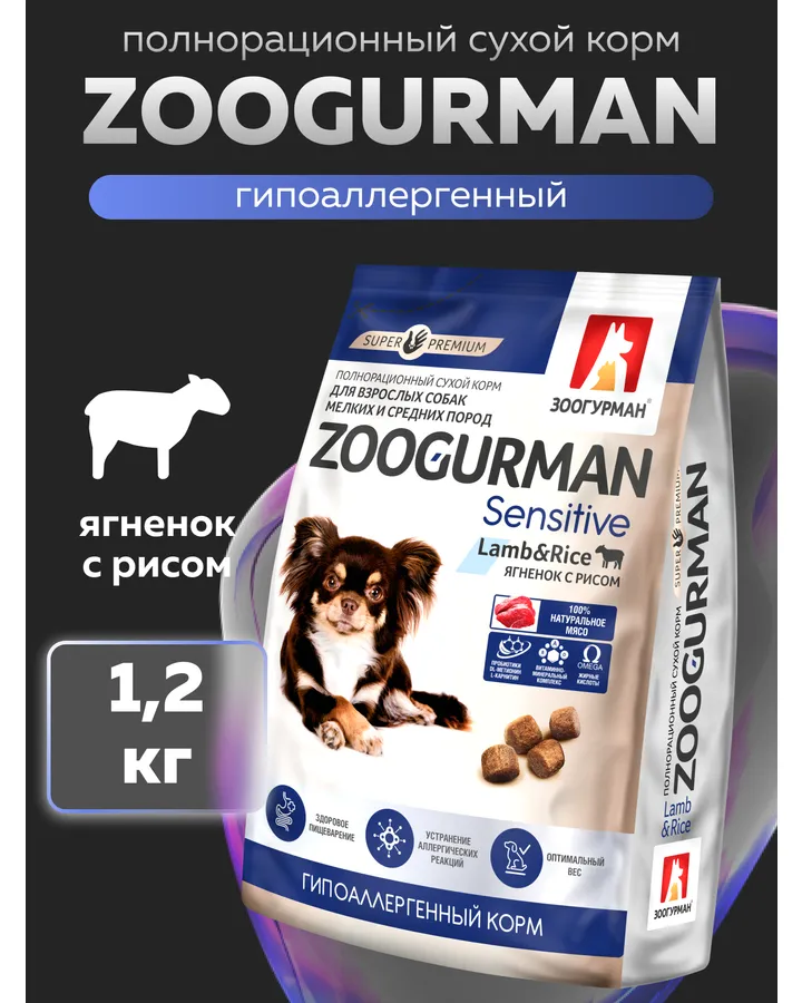 Корм для собак Зоогурман 1,2 кг Sensitive для малых и средних пород ягненок с рисомКорм хороший. Собачка ест без энтузиазма, гранулы великоваты.