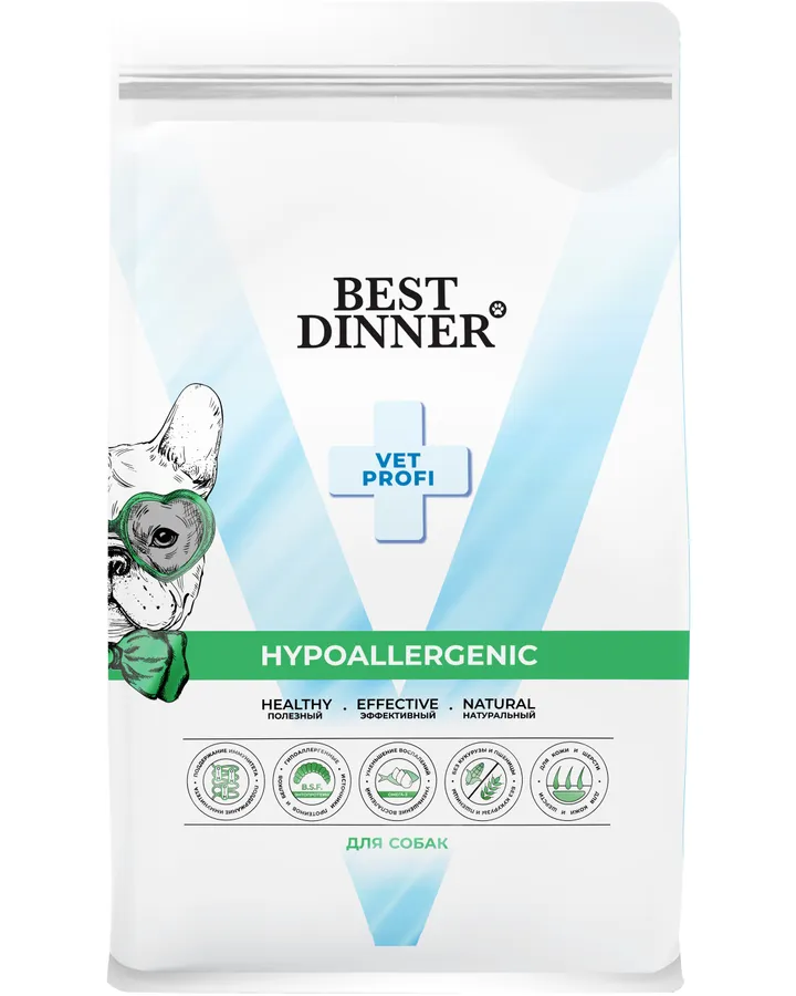 5Корм для собак всех пород Best Dinner Vet Profi Hypoallergenic при пищевой аллергии и непереносимости 2кгПерешли на этот корм. Прошла аллергия. Пёс с удовольствием ест.