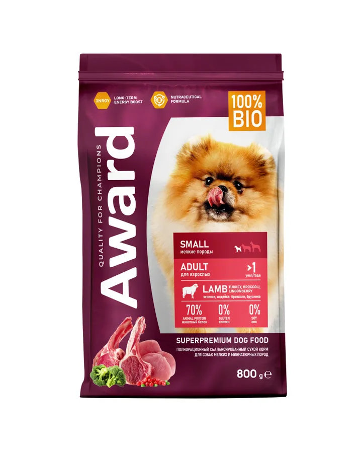 5Корм для собак Award 2кг всех пород с ягненком и индейкой с добавлением яблока и черники сухойХороший