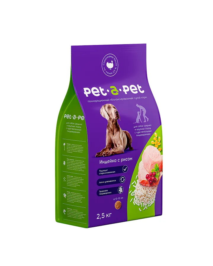 Корм для собак Pet-a-Pet 2.5кг средних и крупных пород с чувствительным пищеварением с индейкойНакопительная скидка