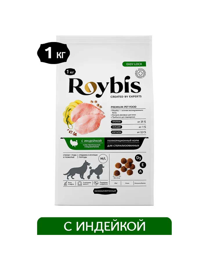 Корм для собак Roybis 3кг средних и крупных пород с чувствительным пищеварением стерилизованных с индейкой сухойВсе от отлично