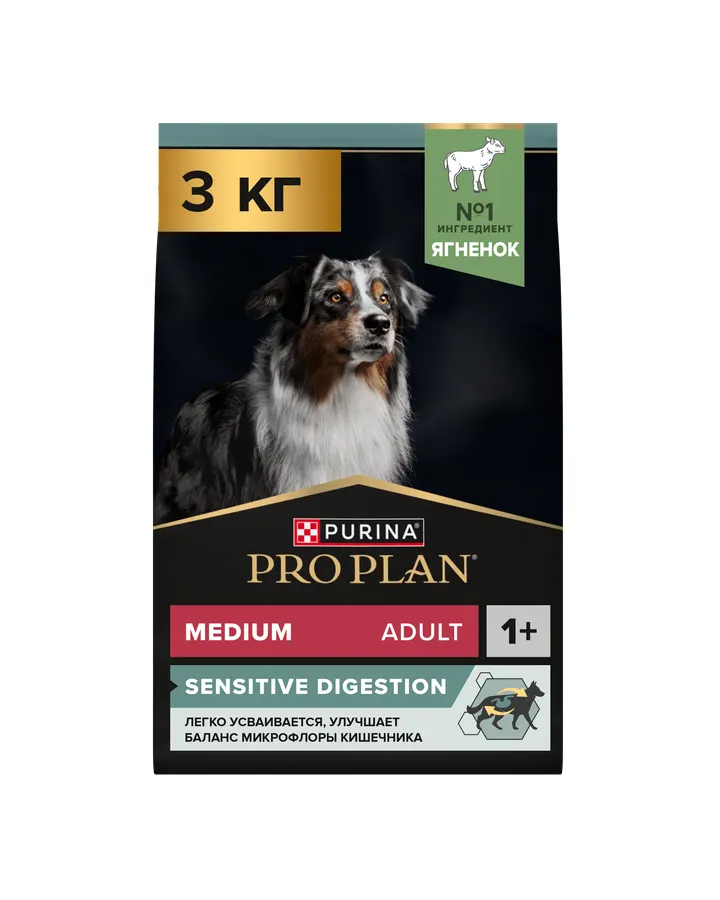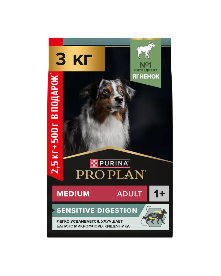 Корм сухой для взрослых собак PRO PLAN средних пород с чувствительным пищеварением ягненок 2.5кг + 500г в подарокНакопительная скидка