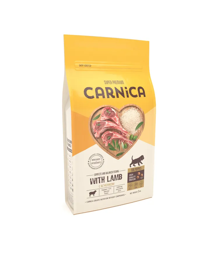 Корм для щенков Carnica 0.8кг ягненок-рис для средних и крупных пород сухойИнтересный корм. В начале, как купила, долго нюхал, даже почему-то гавкать на корм стал))))). Смешала с Роял конином, так как от него после 2 упаковок наотрез отказался, уплетал, аж треск стоял. А сейчас в начале выберет его, а потом Роял конин poppy доедает.