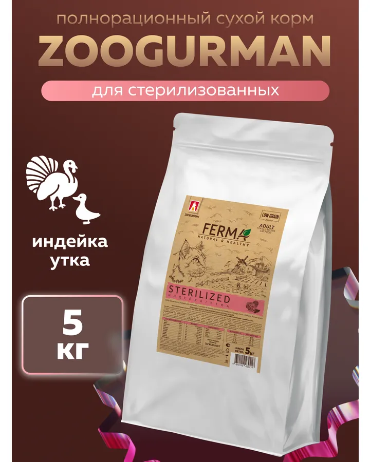 Корм сухой Зоогурман FERMA STERILISED Индейка, Утка 1,5 кгКорм хороший