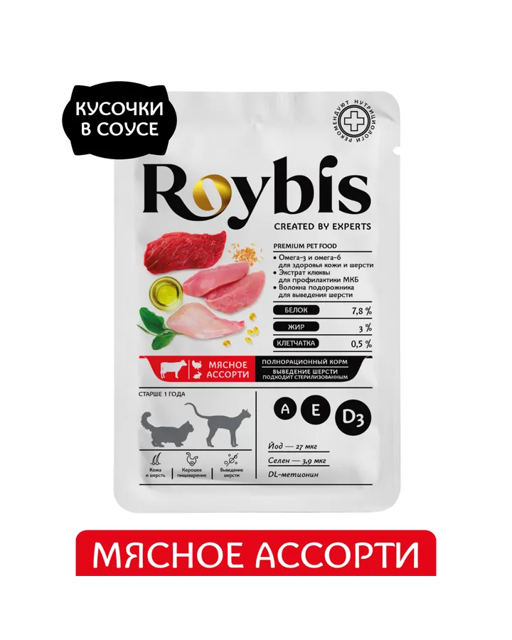 Корм для кошек Roybis 85г мясное ассорти кусочки в соусе для выведения комочков