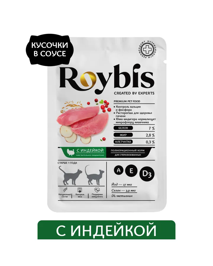 Корм для кошек Roybis 85г стерилизованных с чувствительным пищеварением индейка кусочки в соусе