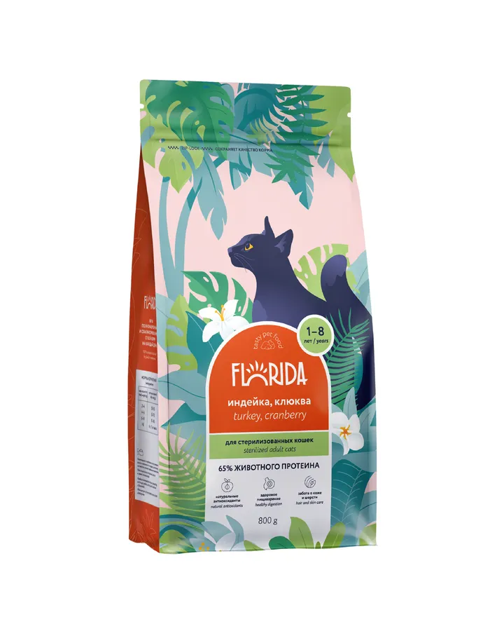 Корм для кошек Florida для стерилизованных сухой индейка клюква 800г