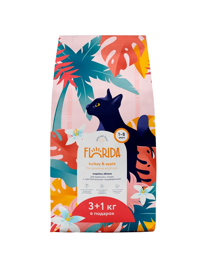 Корм для кошек Florida 800г с чувствительным пищеварением индейка-яблоко