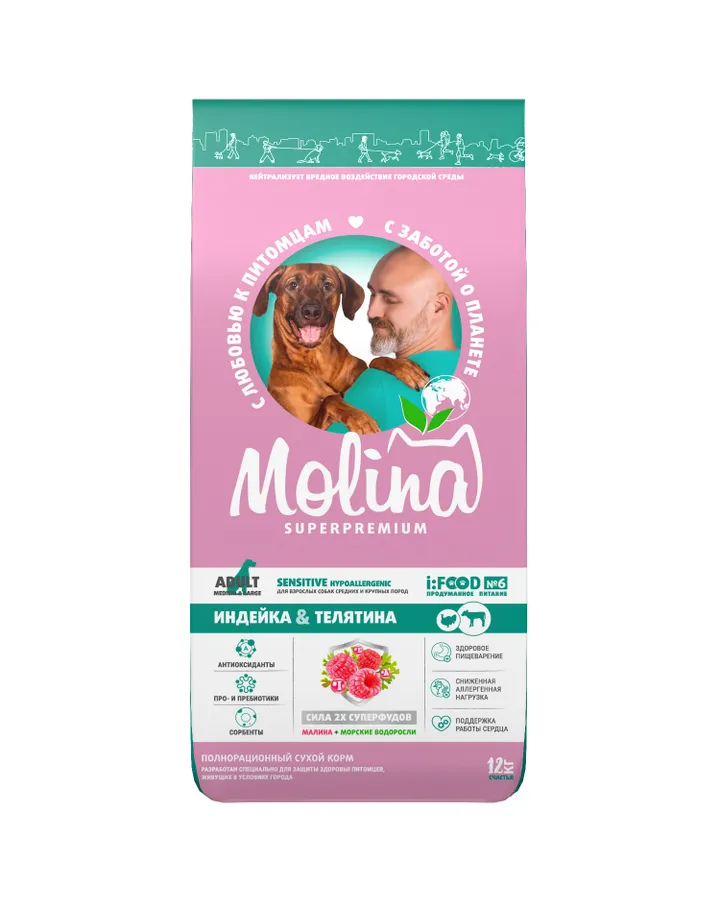 Корм для взрослых собак и крупных пород Molina Sensitive сухой с индейкой и телятиной 12кг