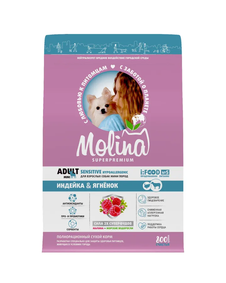 Корм для взрослых собак мелких пород Molina Adult mini sensitive сухой с индейкой и ягненком 0.8кг
