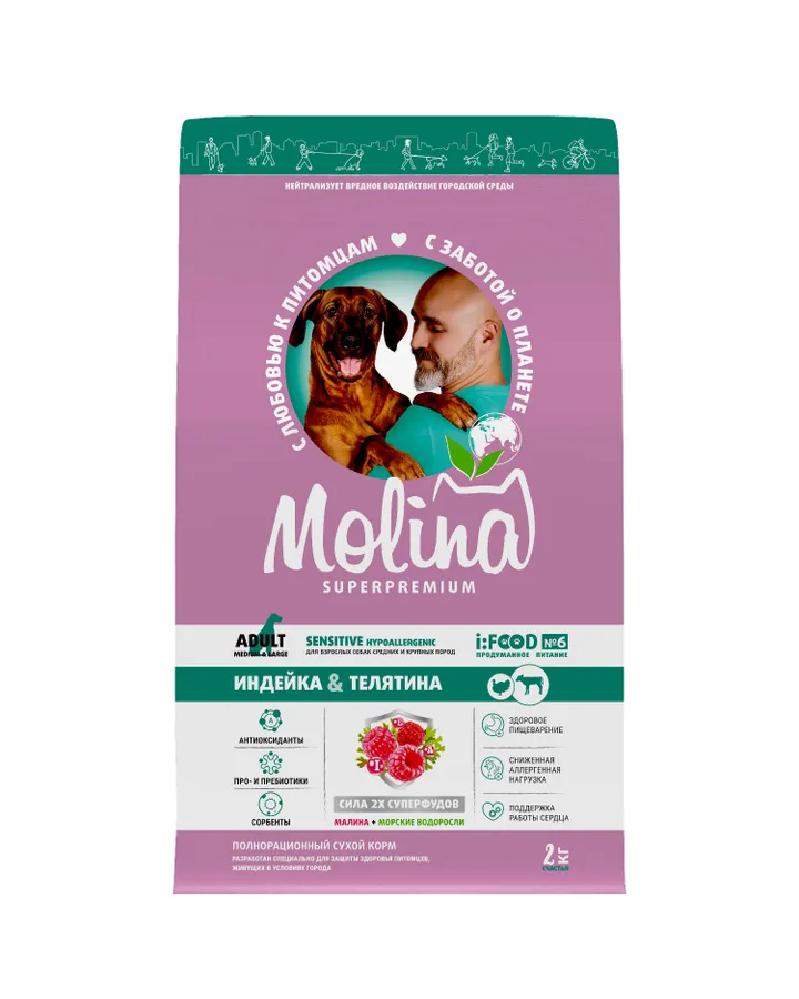 Корм для взрослых собак крупных пород Molina Sensitive сухой с индейкой и телятиной 2кг