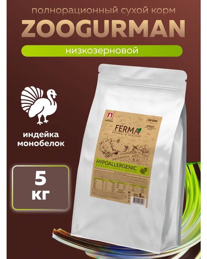 Корм сухой Зоогурман FERMA HYPOALLERGENIC, Индейка, Моно Белок 5 кгХороший корм, берем его уже около полугода, собаки едят с удовольствием именно данный вкус Партии приходят всегда свежие Гранулы подходящего размера для мелких пород