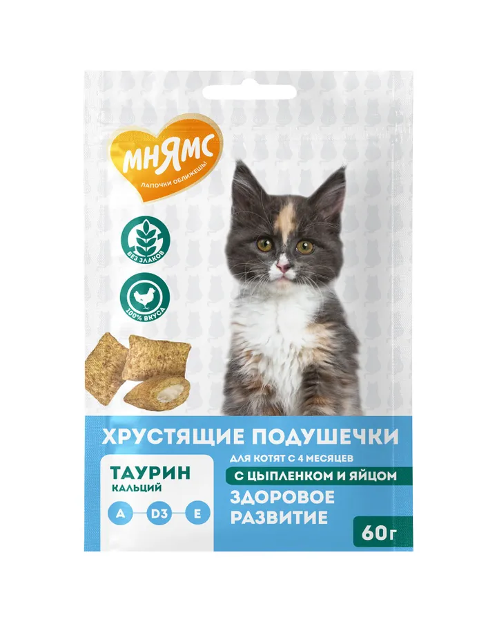 Лакомство для котят Мнямс хрустящие подушечки с цыпленком и яйцом 60г