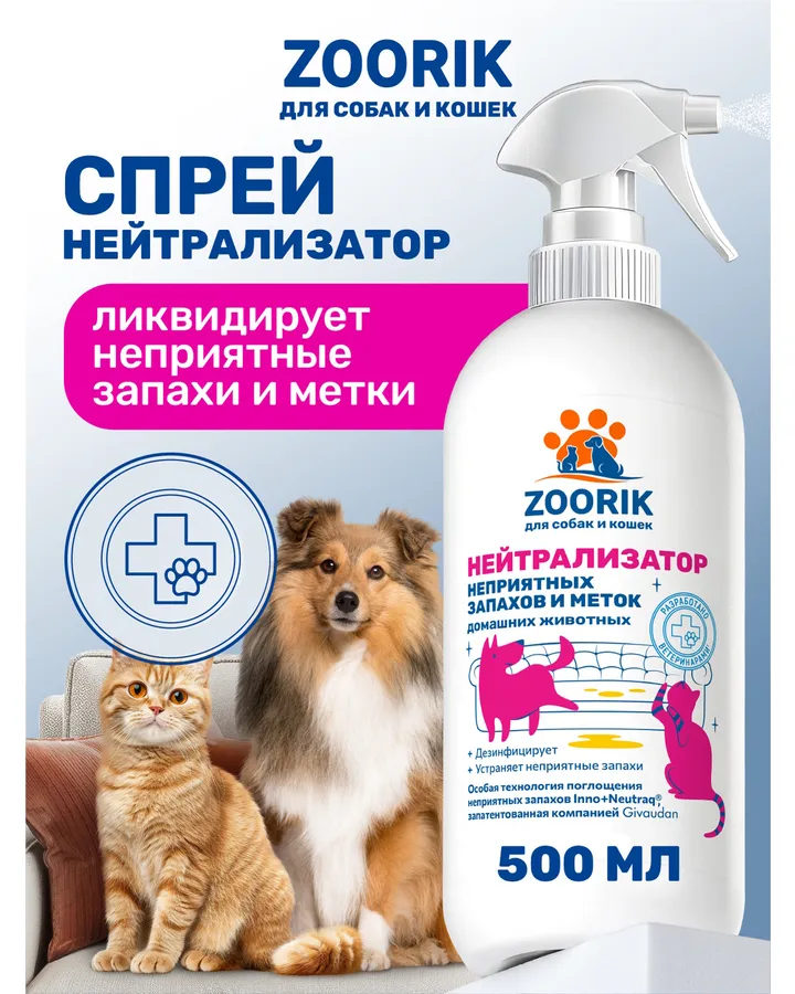 Нейтрализатор запаха ZOORIK для собак и кошек 250 млПомогает, запах специфический, коты наперегонки несколько раз подбегали, нюхали, больше не гадили.
