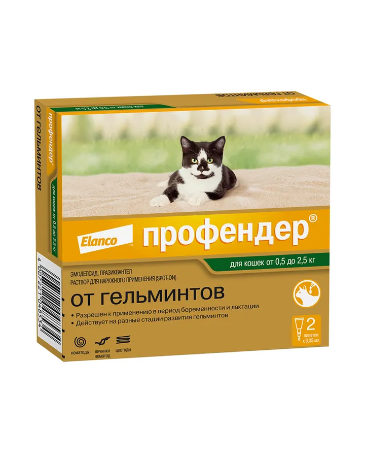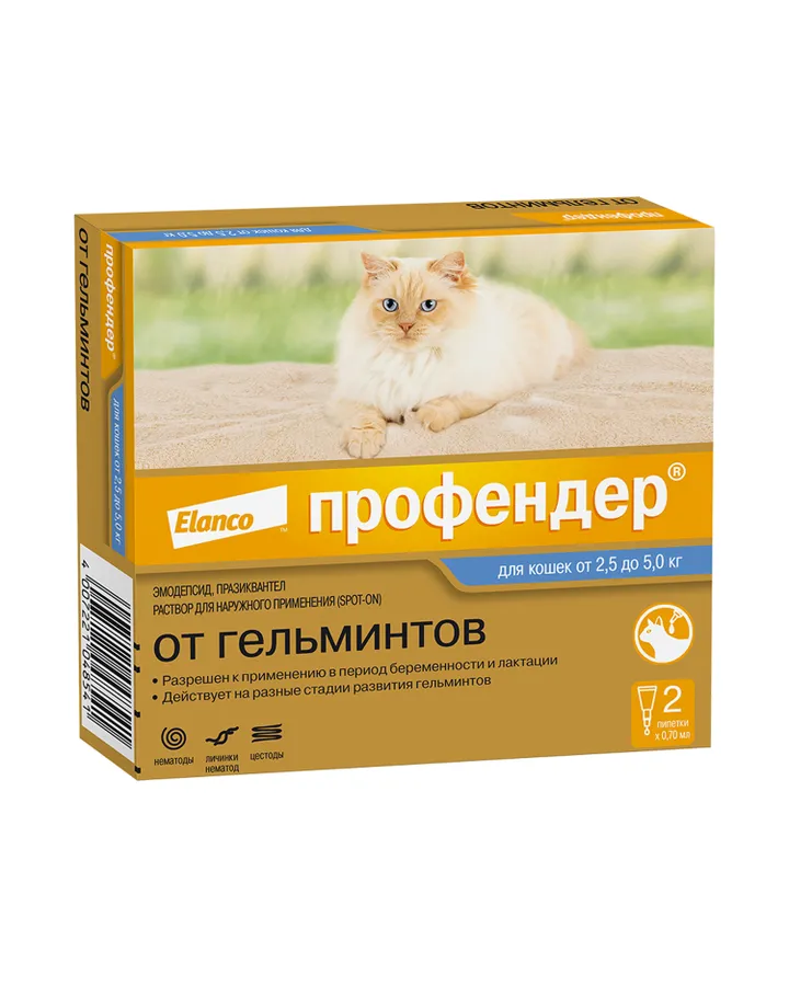 5Капли для кошек Elanco Профендер от 2.5 до 5кг антигельминтик 2пипеткипомогло, кот стал меньше чесаться. удобный формат, быстро и легко