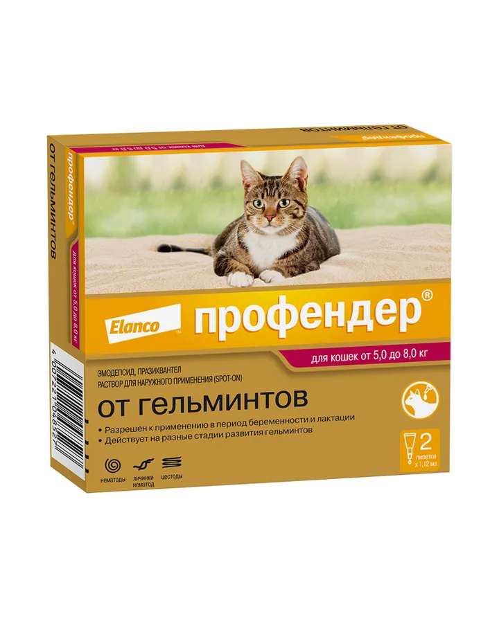5Капли для кошек Elanco Профендер от 5 до 8кг антигельминтик 2пипеткиПроверенный при многолетнем использовании товар. Рекомендован врачом
