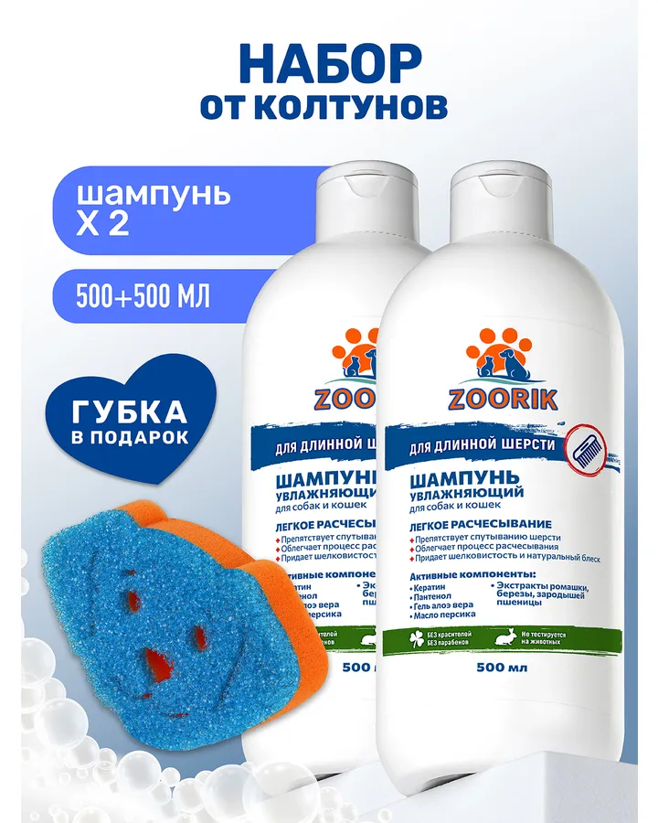 Шампунь ZOORIK для длинной шерсти увлажняющий с губкой 500 мл - 2 шт
