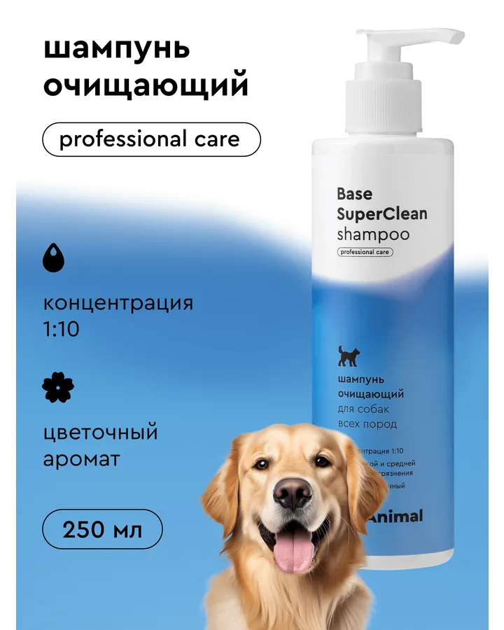 Base SuperClean ProAnimal Универсальный профессиональный очищающий для собак / с белой шерстьюШампунь хороший, отлично отбеливает, проверяла на белых лапах, которые чёрные, после прогулки. Сухость не вызывает. Жаль, что больше нет в наличии