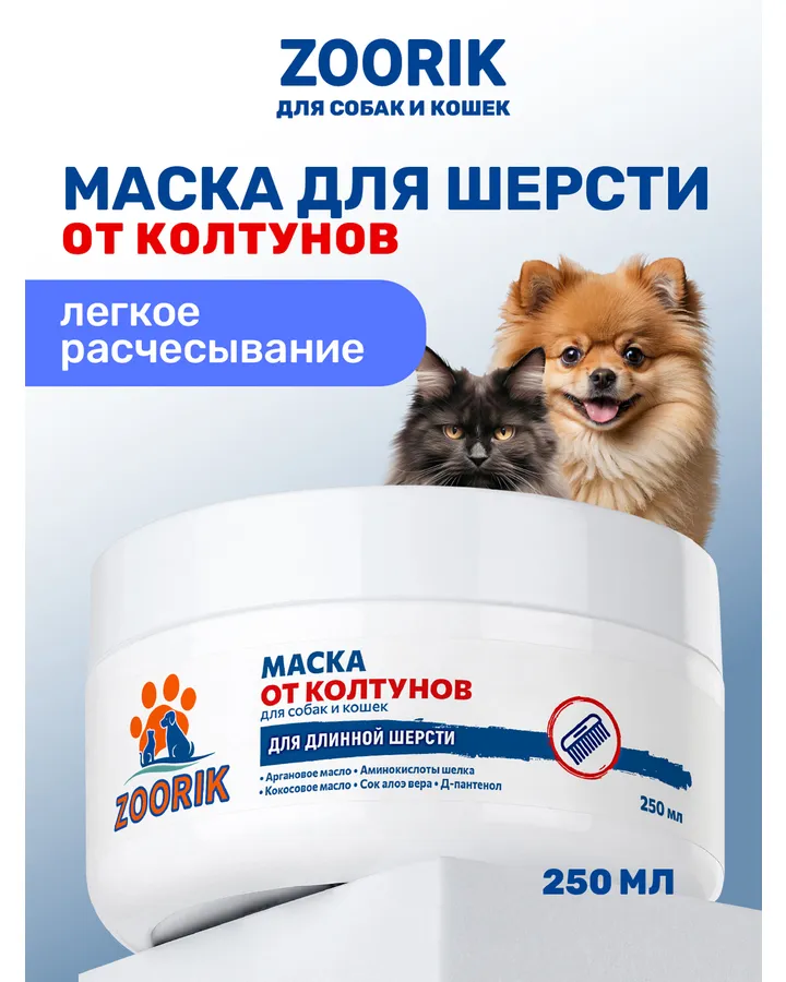 Шампунь для длинной шерсти ZOORIK увлажняющий 250 млХороший, регдольчика пухового белого отмыл, аллергии не было, использовала с маской, а вот пшикалка напугала, сама пользуюсь. Закудрявился правда, но это наверно он такой от природы