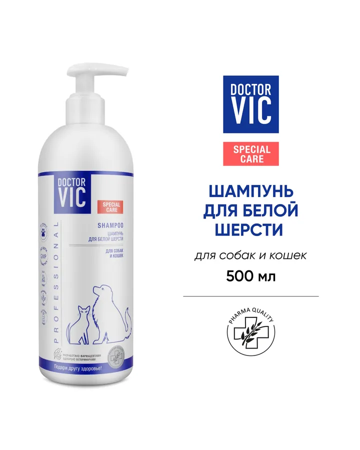 Шампунь для собак и кошек Doctor VIC Professional для белой шерсти 250млШампунь хороший, брала для длинношнрстой белой чихуахуа, шерсть после мытья гладкая и блестящая.
