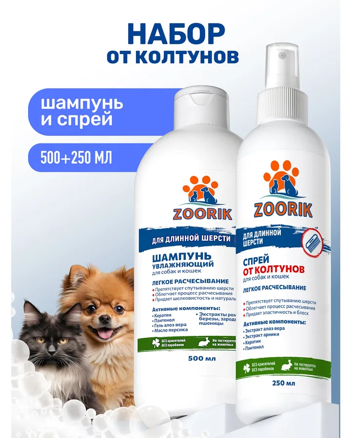 Набор ZOORIK шампунь для длинной шерсти и спрей от колтунов 500+250 мл