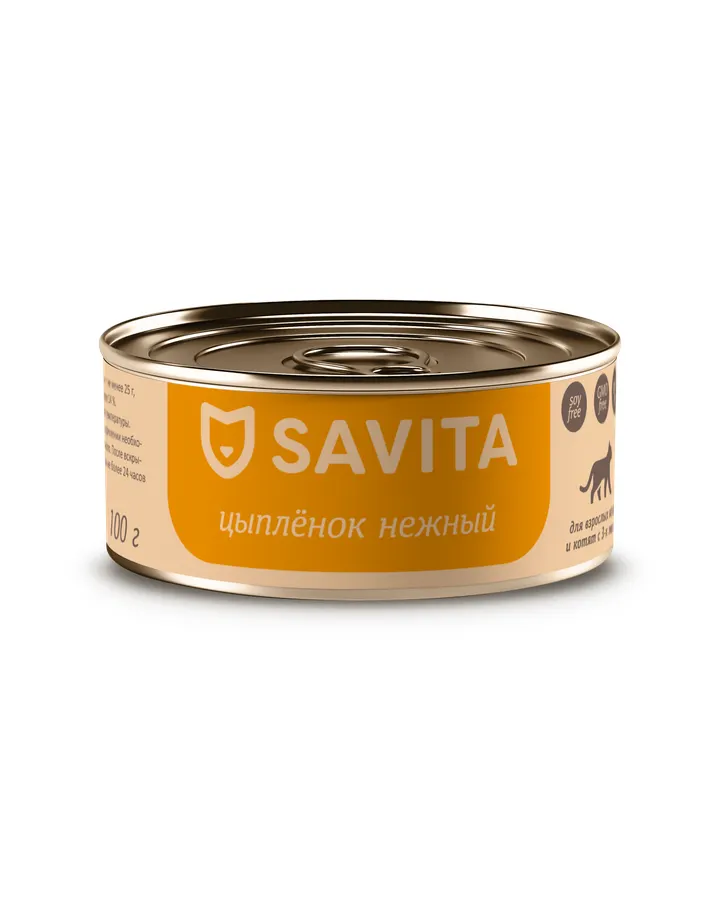 5Консервы для кошек и котят SAVITA Цыпленок нежный 100гХороший состав, реально одно мясо, кошка ест с удовольствием