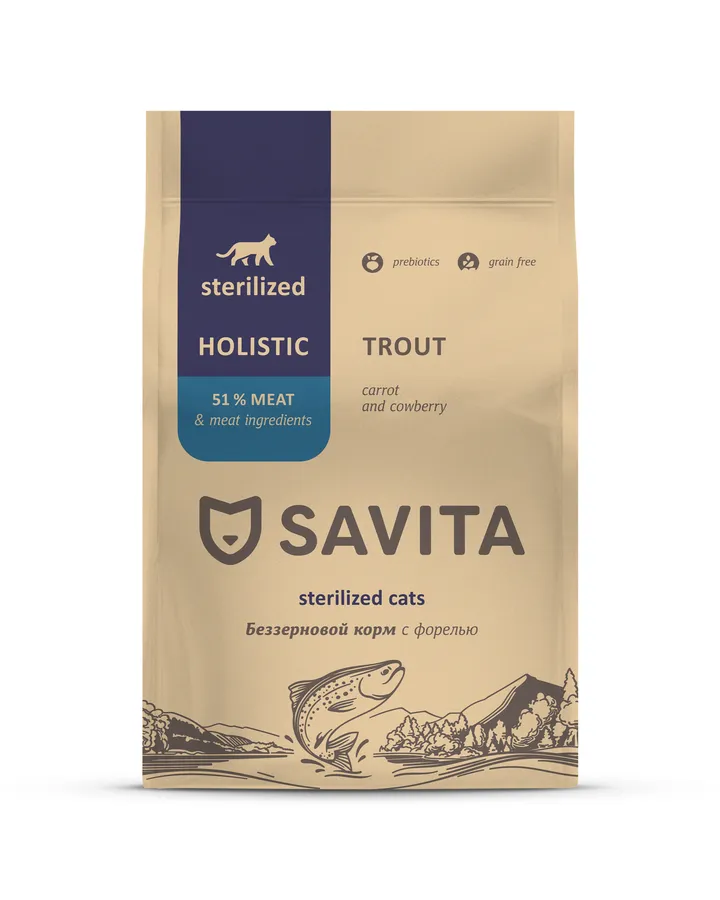 Корм для кошек SAVITA для стерилизованных сухой беззерновой с форелью 400г