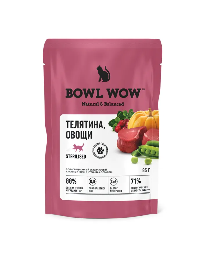 Полнорационный влажный корм BOWL WOW в соусе для котят и беременных кошек с ягненком и овощами 85г