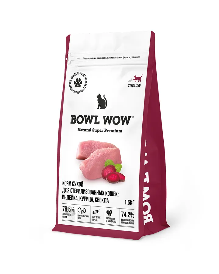 Корм сухой полнорационный BOWL WOW для взрослых кошек с индейкой, курицей и яблоком 400г