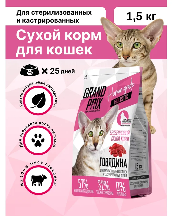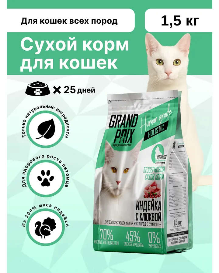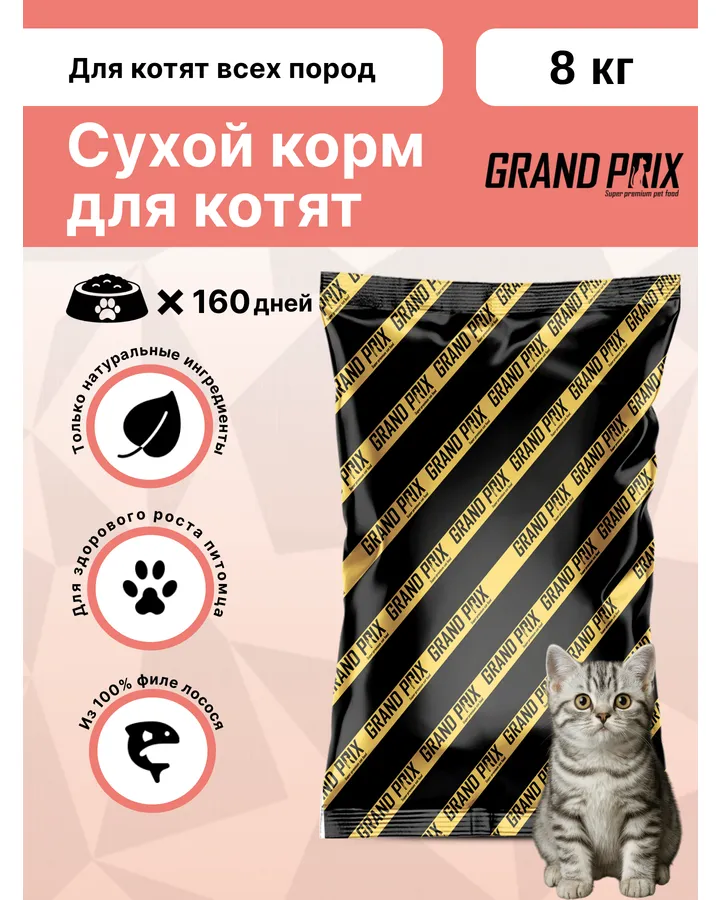 4Корм сухой Grand Prix Для кошекКорм хороший,гранулы крупные,но кошке есть удобно,пахнет хорошо,состав вроде тоже норм.