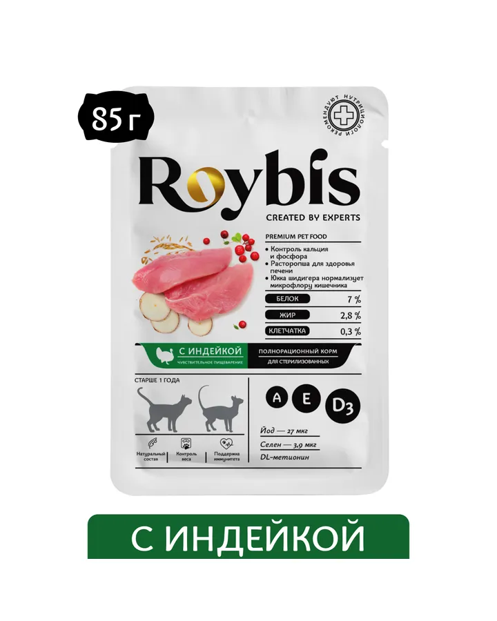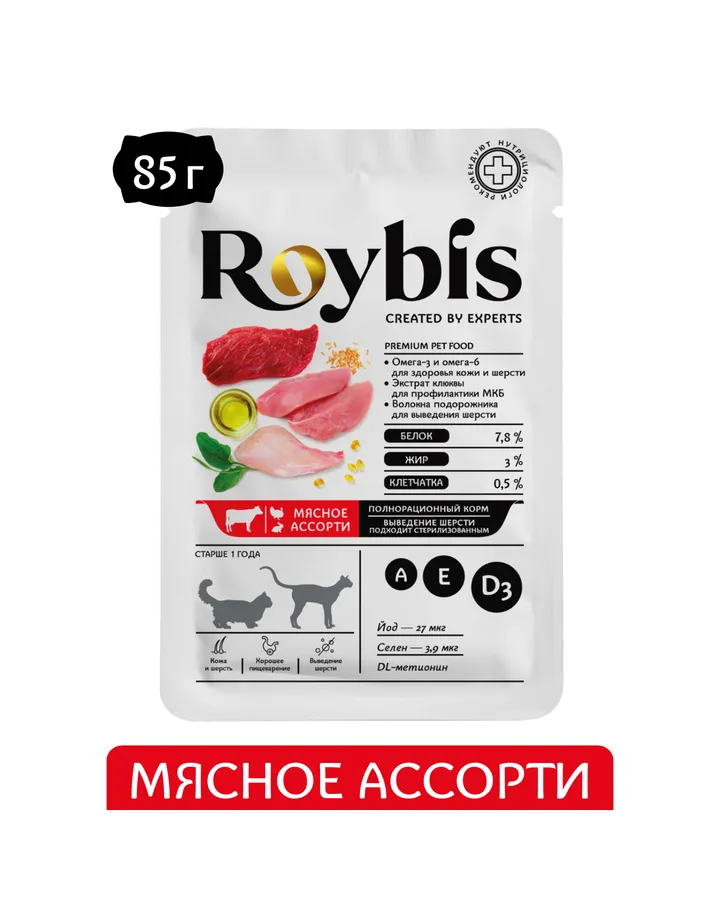 5Корм для кошек Roybis 85г мясное ассорти кусочки в соусе для выведения комочковКот ест с удовольствием.