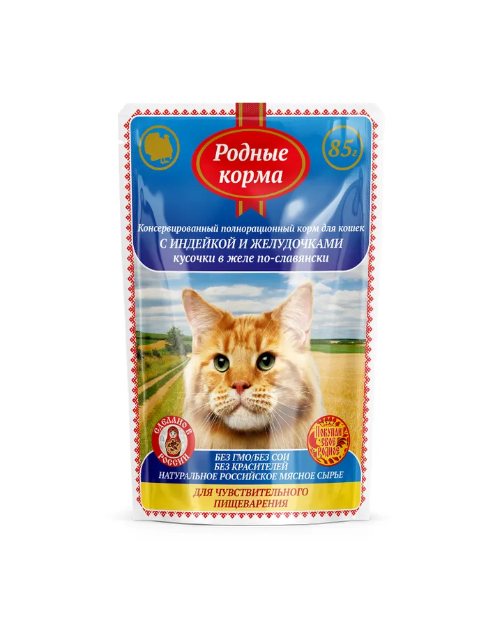 5Корм для кошек Родные корма с чувствительным пищеварением По-крымски с ягненком кусочки в соусе 85гКоту нравится.