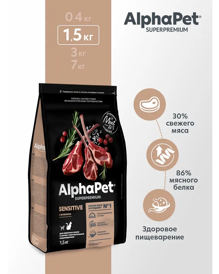 Корм для кошек AlphaPet Superpremium 1.5кг чувствительное пищеварение с ягненком сухойХороший корм, коту подошёл