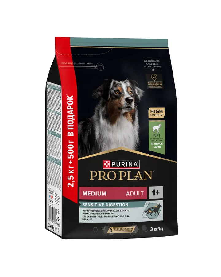 Корм сухой для взрослых собак PRO PLAN средних пород с чувствительным пищеварением ягненок 2.5кг + 500г в подарокКатегории