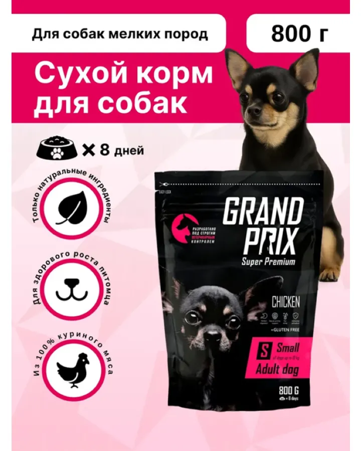 Сухой корм для взрослых собак мелких пород GRAND PRIX Small Adult гранпри с курицей 800 г.