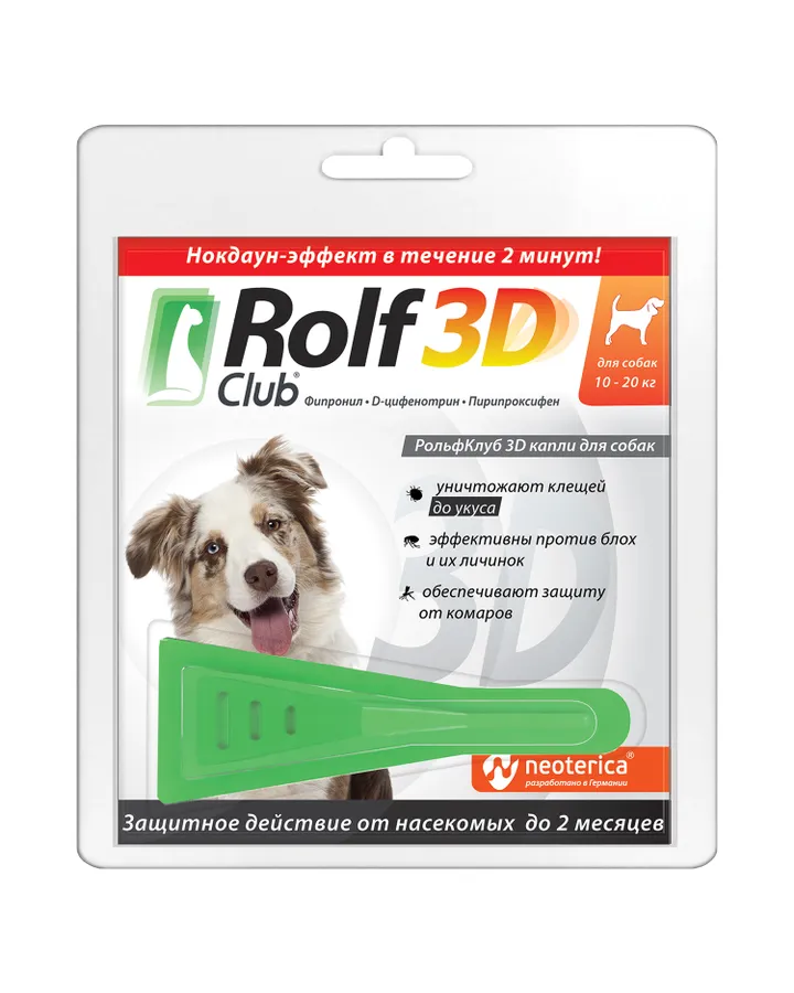 Капли для собак RolfClub 3D 10-20кг от блох и клещей 3пипетки