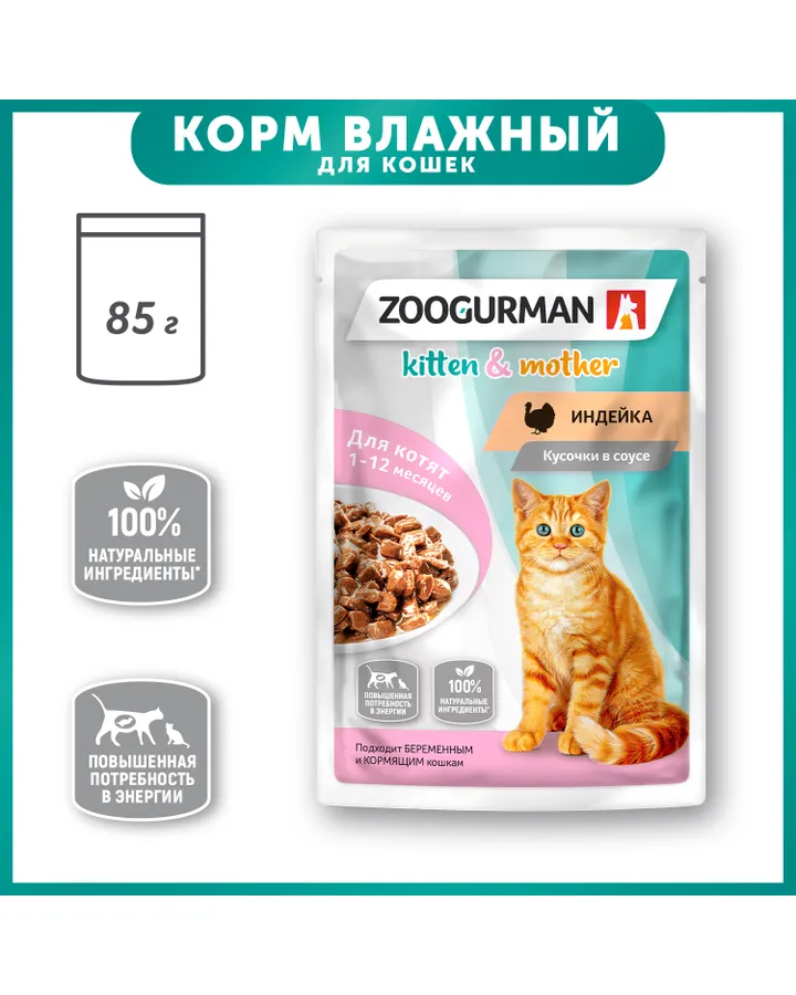Корм влажный Зоогурман МуррКисс Индейка с телятиной, 100 г х 15штДаю иногда коту (18 лет) для радости в жизни и дополнительной витаминной добавки. Корм для котят кушает с удовольствием, так как очень любит разнообразие.