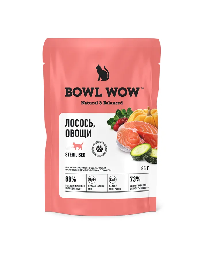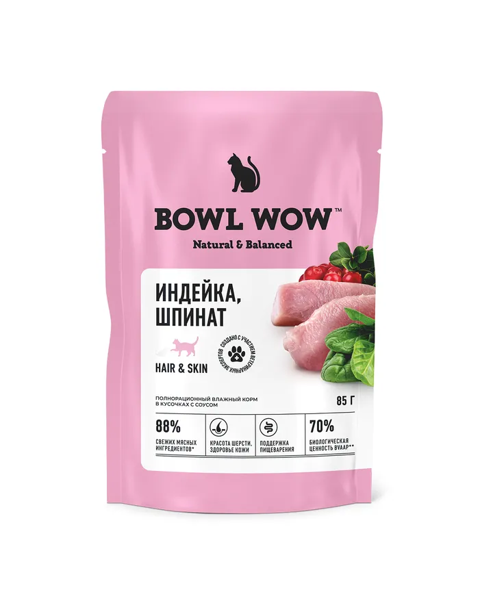 Полнорационный влажный корм BOWL WOW в соусе для здоровой кожи и шерсти кошек с индейкой и шпинатом 85г