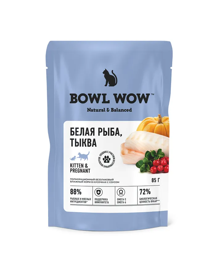 Полнорационный влажный корм BOWL WOW в соусе для котят и беременных кошек с ягненком и овощами 85г