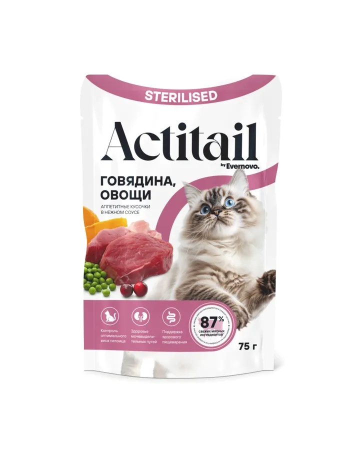 Полнорационный влажный корм Actitail для стерилизованных кошек. Кусочки в соусе с говядиной и добавлением овощей 75 г