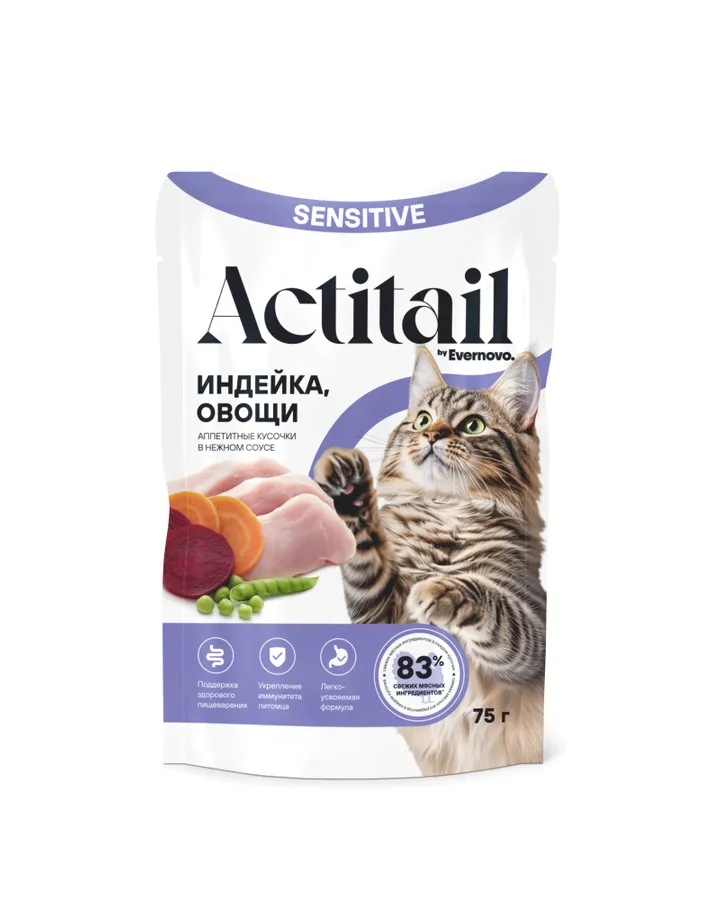 Полнорационный влажный корм Actitail для взрослых кошек с чувствительным пищеварением с индейкой и овощами 75 г