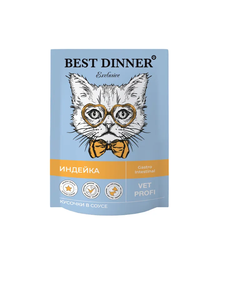 Корм для кошек Best Dinner 85г Exclusive Vet Profi Gastro Intestinal кусочки в соусе с индейкойКорм низкоуглеводный, рекомендован врачом моей кошке с сахарным диабетом, кошке нравится .