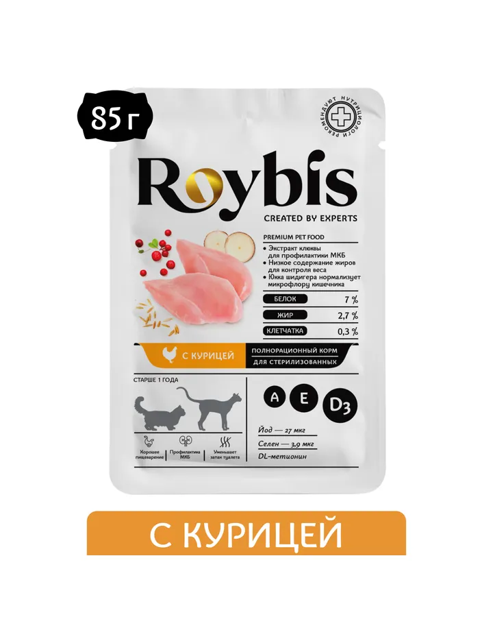 Корм для кошек Roybis 85г с курицей кусочки в желе для поддержания здоровья кожи и шерстиПриятный запах