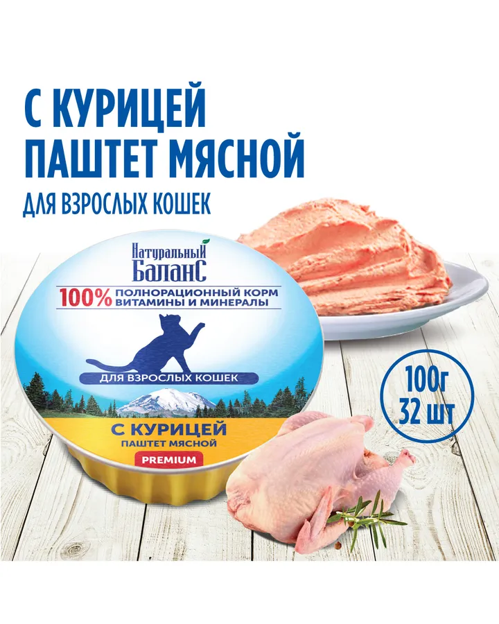 Влажный корм для кошек Натуральный Баланс паштет с курицей 100г х 32шт